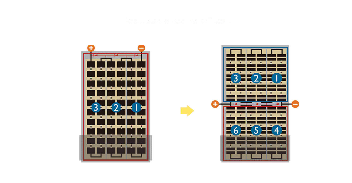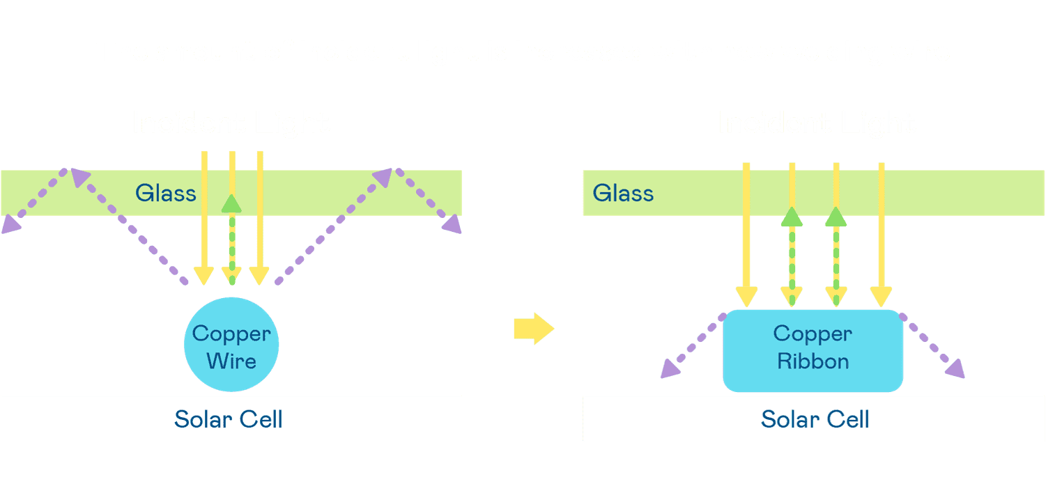 - 电池使用多条铜导线 (Copper wire) 于电池片上形成较短的电流路径,,,提高电流收集效率,,,,采用圆形设计的铜导线较传统扁平式的铜焊带 (Ribbon),,可增加入射至电池的光线量。。